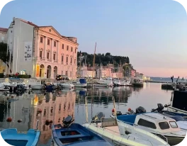 a charming seaside town with narrow streets, colorful buildings, and the Adriatic Sea.
